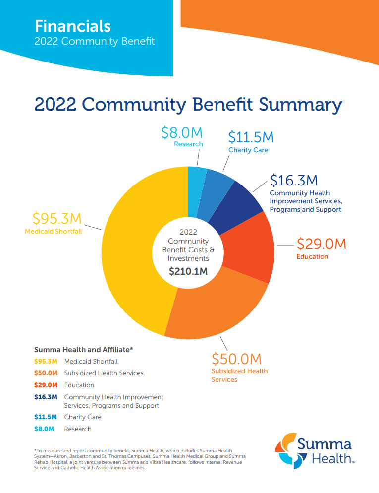 Our work continues to evolve as the needs of the community evolve. In 2022, Summa Health contributed $210.1 million in community benefit. Although this report provides a specific dollar amount, the true impact of our work is immeasurable. We remain committed to continuously improving the health of the communities we serve.