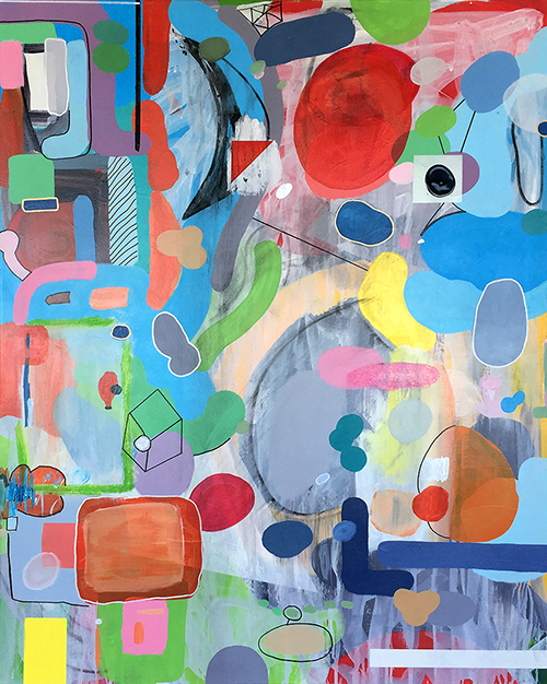 Materials: Mixed media on canvas (acrylic, gesso, charcoal, oil pastels, paint markers, and graphite)